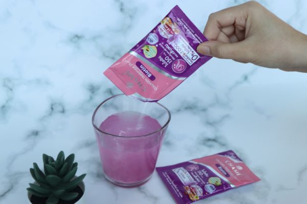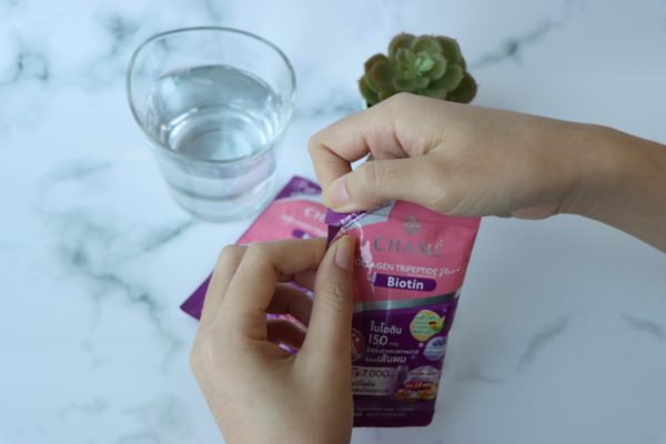 1. ฉีก ซองชาเม่ คอลลาเจน ไตรเปปไทด์ พลัส ไบโอตินเทผสมลงน้ำสะอาด