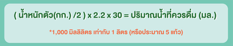 (50/2) x 2.2 x 30 = 1,650 มิลลิลิตร ดังนั้นน้ำที่ควรดื่ม คือ ประมาณ 8 แก้ว ต่อวัน